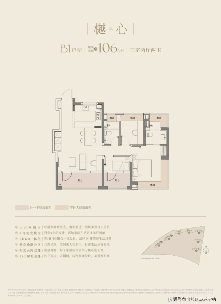 建筑面积约106㎡户型,更是以宽尺大横厅和270°的转角飘窗赚足了眼球,阳光与清风自由流淌,居住舒适度全面提升。