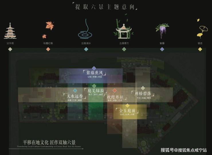 将州桥老街、秋霞圃、远香湖、古猗园、紫藤园、银杏古树等嘉定6景提炼、转译,形成了具有在地文化特色的6大景观主题空间。