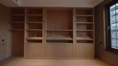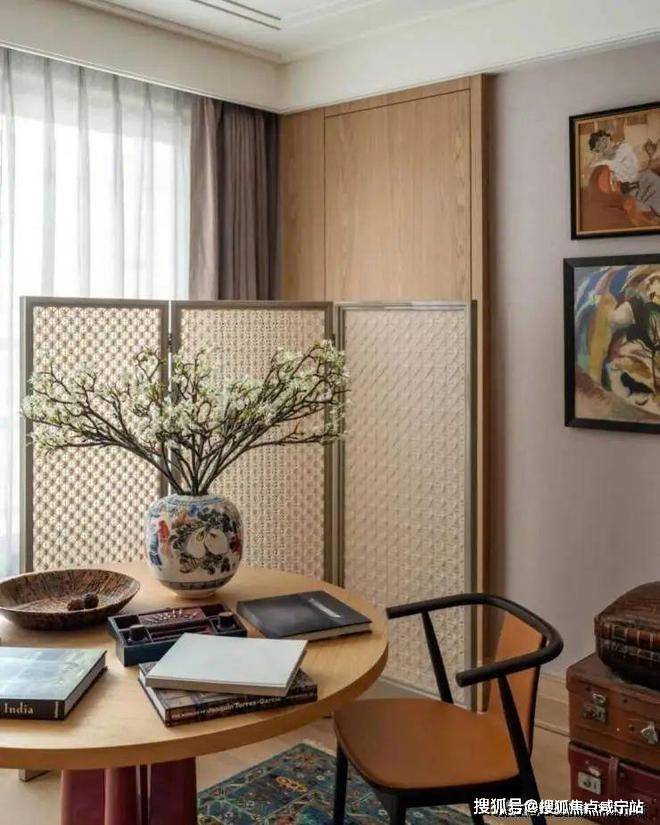 多功能书架彰显着设计的巧思,形成有如博物馆般的展示方式,即可放置日常读物,亦可展示珍本藏书。同时,利用屏风做隔断,与圆桌结合形成私密空间。