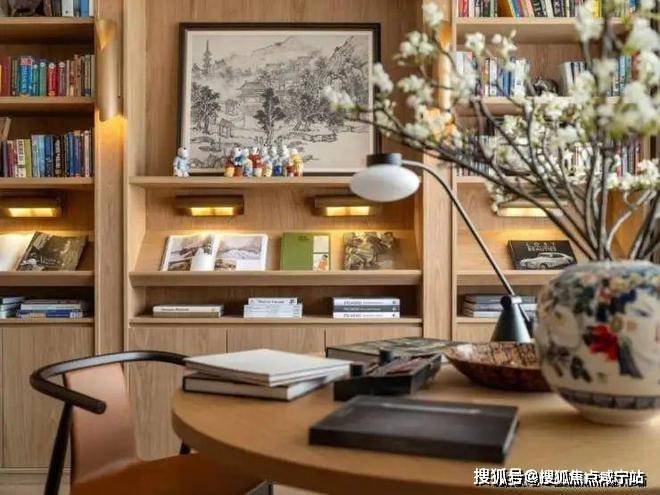 书房色调沉稳大气,精心设计的柔和灯光突显书香气韵,吸引人们长久驻足,于宁静的氛围中品味知识的力量。