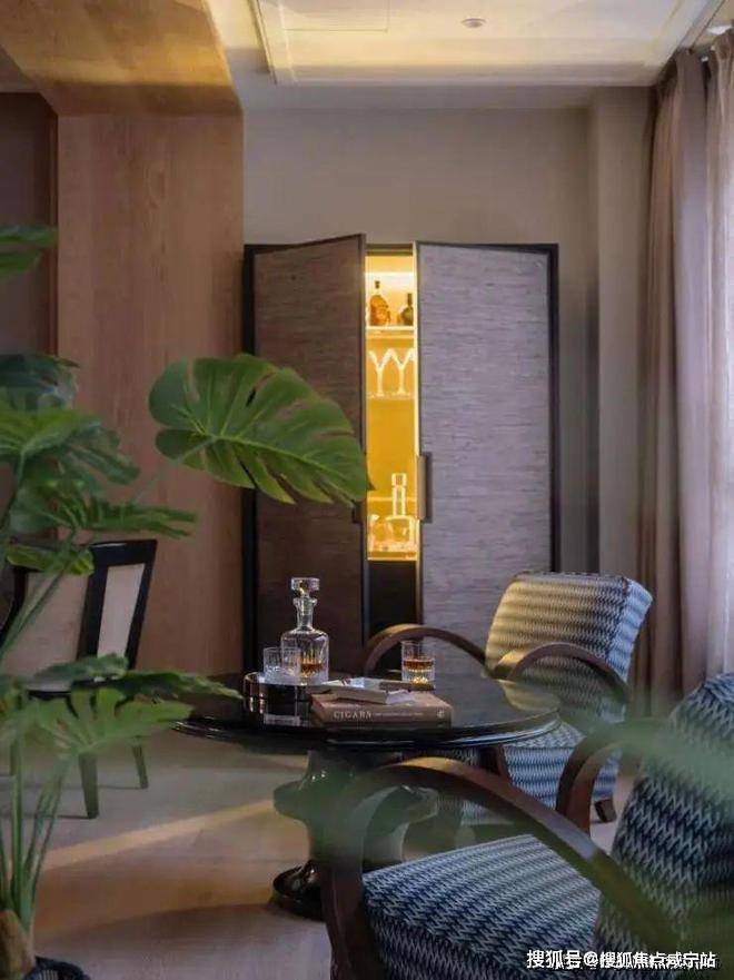 客厅另一端,是连接房内与外景的介质空间,在这里主人和客人可以享受美酒雪茄。看似独立的空间,实际延伸了客厅的功能,也延伸了窗外景观到室内的视线。