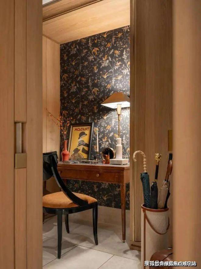玄关具有变化性与功能多重性,壁纸融合中西方色彩和纹样,除了更衣功能,更摆放了古董书写桌,以手写文字传递信息,传递慢节奏生活方式,丰富空间的装饰和功能,目光所及视角变得丰富。