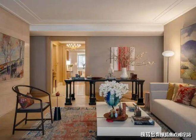 主要位置的多功能大长桌,可以做书桌,聚餐冷餐摆台,也可以做艺术品展示桌,让艺术与空间交融相生。同时,大长桌也起到了模糊走廊与客厅空间的作用,无形中放大空间的层次感,增添了空间的功能性。