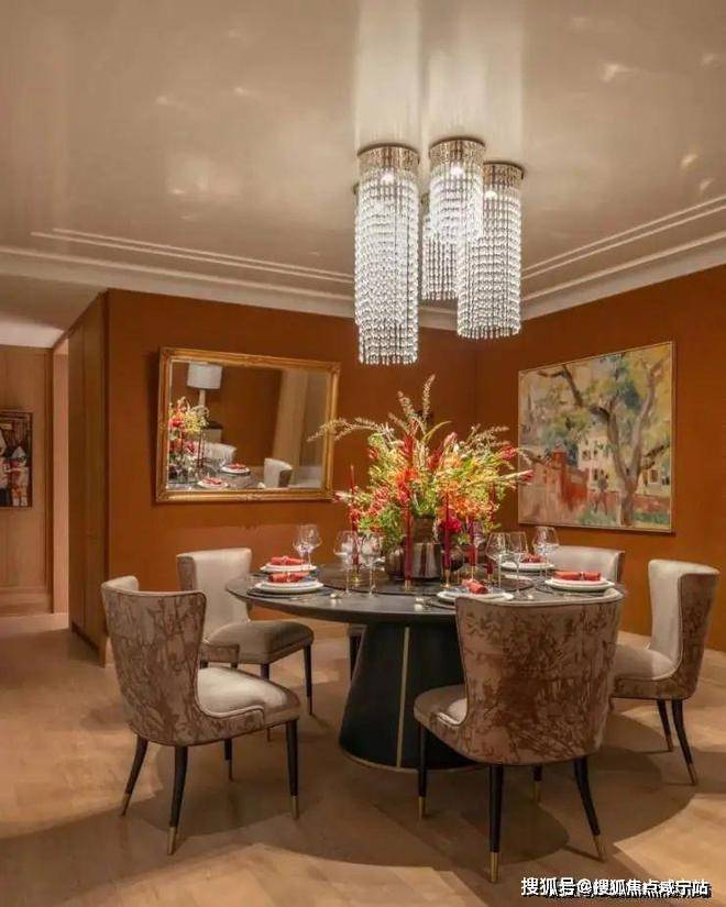 餐桌上盛放的热带花卉与橘色亚麻帆布面壁纸,一同传递出热烈的情感,一幅展现自然风光的画作《TheOldWalnutTreeB》丰富了空间的色调,在贵雅的氛围中妆点质朴与原始的美。