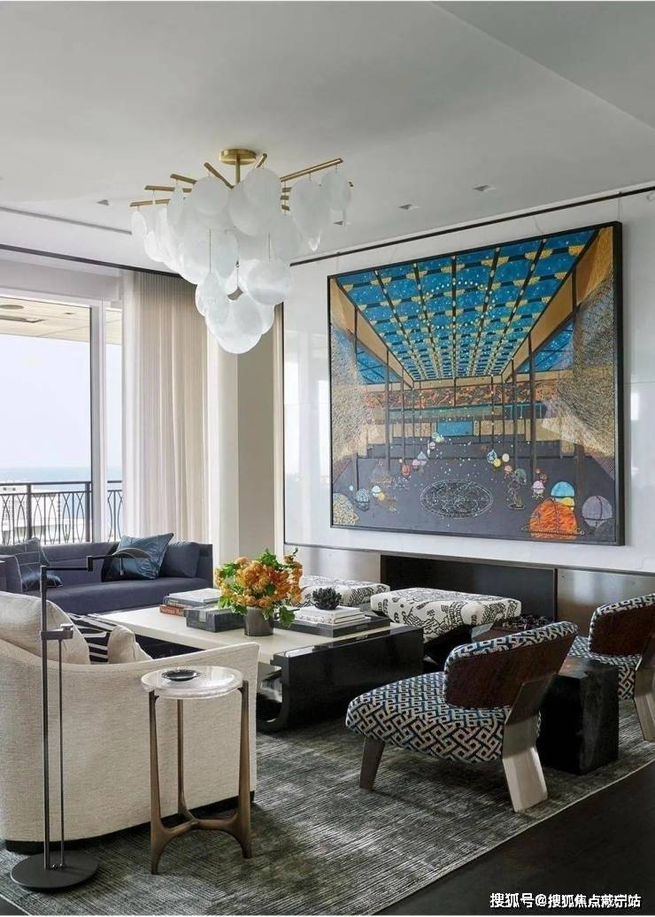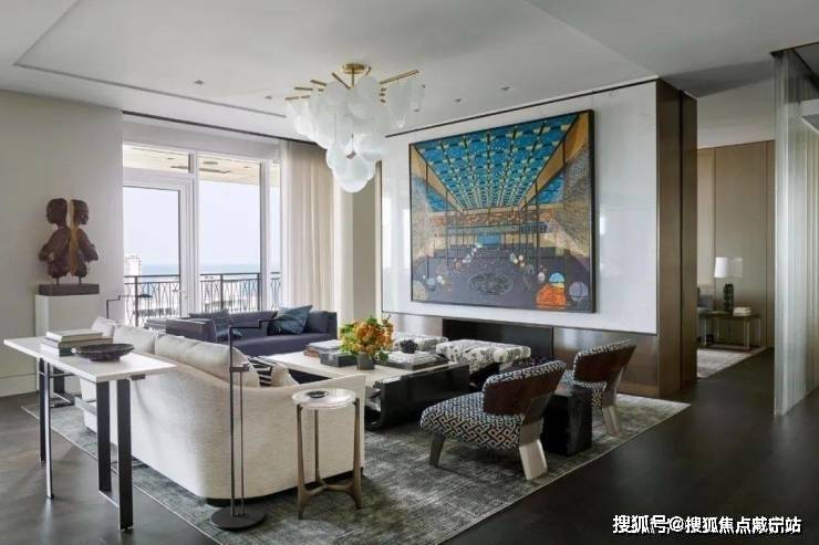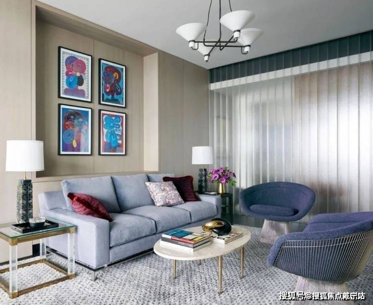 从客厅开始,整个空间都遍布着蓝色的元素,设计师以星座为主题进行设计,搭配上JamesThomas的茶几、HollyHunt的沙发、Minotti的扶手椅和AndriannaShamaris的边桌,打造既高级又充满梦幻感的居家空间.