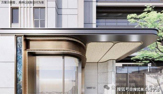 在楼栋主入口同样运用石材+弧形铝板等元素,同时还有格栅装饰,质感提升明显: