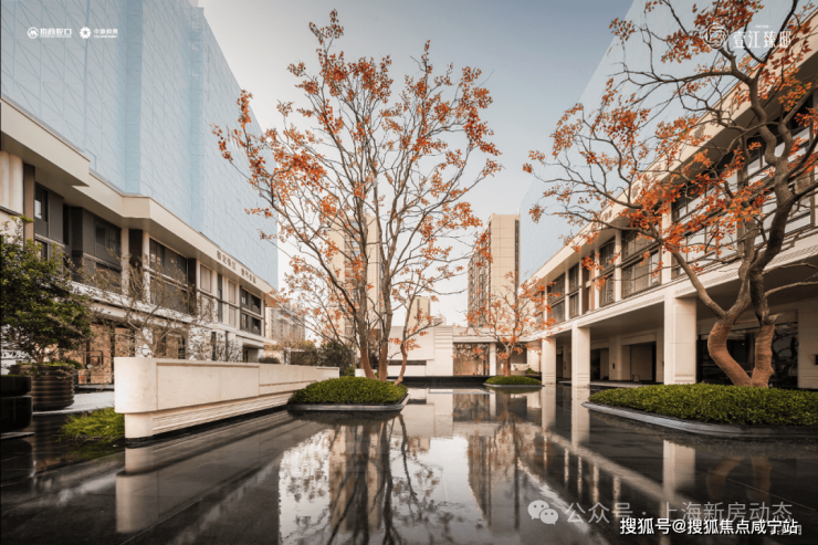超千方镜面主题水院,时刻演绎自然与建筑的无界之美:澄澈镜面水面倒映建筑肌理与天光云影,搭配三株原生丛生乌桕的点缀,与回廊、浮岛相映成趣,营造出静谧雅致的亲水意境,这种沉浸式水景体验生活,在张江高端住区中尤为稀缺。
