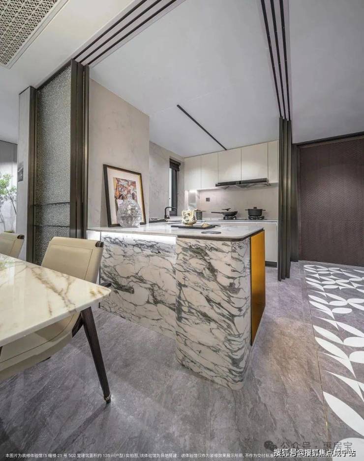 就让我们以项目主打的建面约135平米4房装修体验馆为例,感受一下招商臻境在产品细节上的打磨!空间设计上,入户就能感受到强烈的视觉冲击!客餐厅配合开放式厨房的一体化设计,将产品公共区域的尺度感与社交属性拉满!