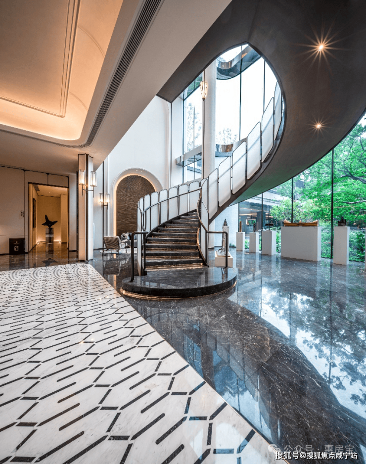 光是这个“追光”坡道就十分带感,以颇具艺术空间感的坡道尺度,香槟金色吊顶,配合天然玻利维亚蓝奢石墙面,追光式的灯带设计,一路好似“星光大道”,高端氛围妥妥拿捏了!车道归家路,奢选金属格栅,通过阵列排布结合防眩光灯光,进一步烘托庄重典雅的鎏金空间氛围;通过轻盈质感的玻璃大门进入内部,敞亮轩朗;同时还有专属等候区,如同酒店式的首层大堂,极尽礼宾仪式。·酒店式归家大门,仪式感满满