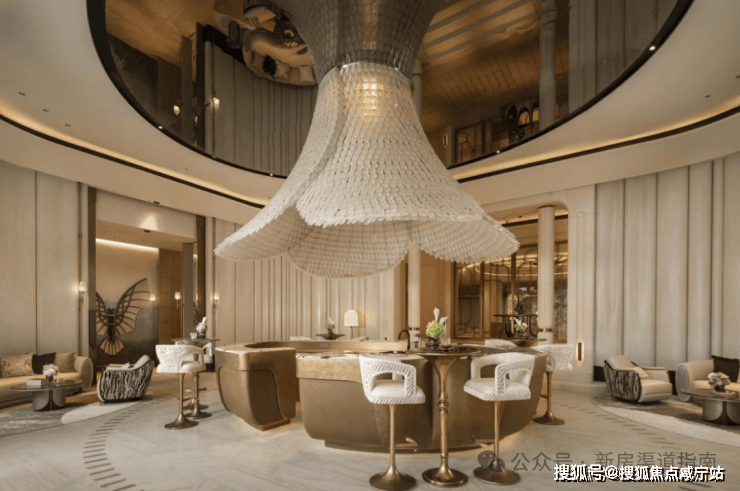 恒温泳池:第一,采用了景德镇烧制的陶瓷马赛克,独特的釉面色彩由景德镇老师傅手工浇筑而成,充满人文艺术底蕴;第二,羽毛天花造型,由600余件铝板打造,表面采用了仿贝壳纹的艺术漆处理,带来松弛度假感;第三,不仅配置了约25m×10m的4道泳池,还采用了奥运会同款空调除湿系统,彰显高档品质细节!