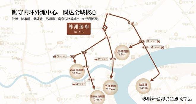“外滩1.2公里生活圈半径内,分布着南京路步行街、豫园商圈、北外滩滨江等顶级配套;地铁4、10、12号线在此交汇,15分钟车程可达陆家嘴金融城,30分钟直达虹桥国际交通枢纽。”