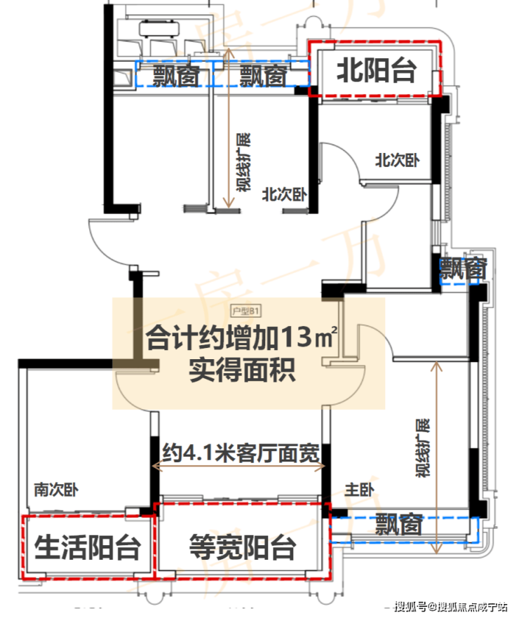 南北三阳台+满飘窗,约13㎡空间,有约140㎡同规格体验。