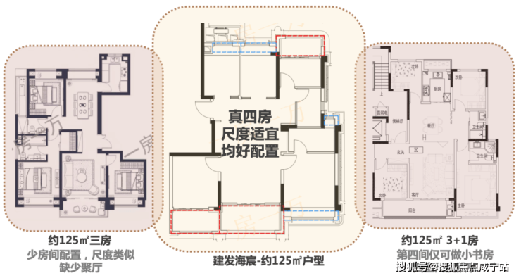 而与右侧的3+1房相比,则可以明显看出建发海宸项目四房的均好性,并没有牺牲真正的使用功能。