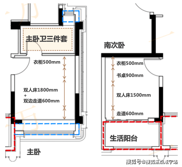 与主卧相同进深尺度,举例来看,可容纳500mm靠墙衣柜+1500mm双人床+600mm单边走道,还剩下约900mm宽度,自由布置书桌或小沙发。