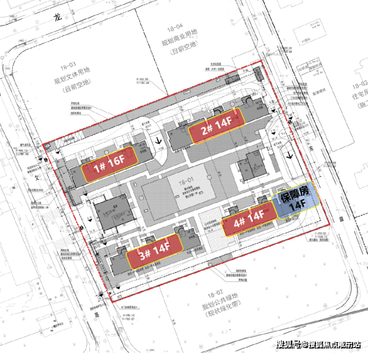 其中18-01为普通商品房,18-03为文体用地,18-04为商业用地。根据项目规划设计方案,18-01地块拟建4幢14-16F住宅,1撞14F保障房,以及配套用房等建筑