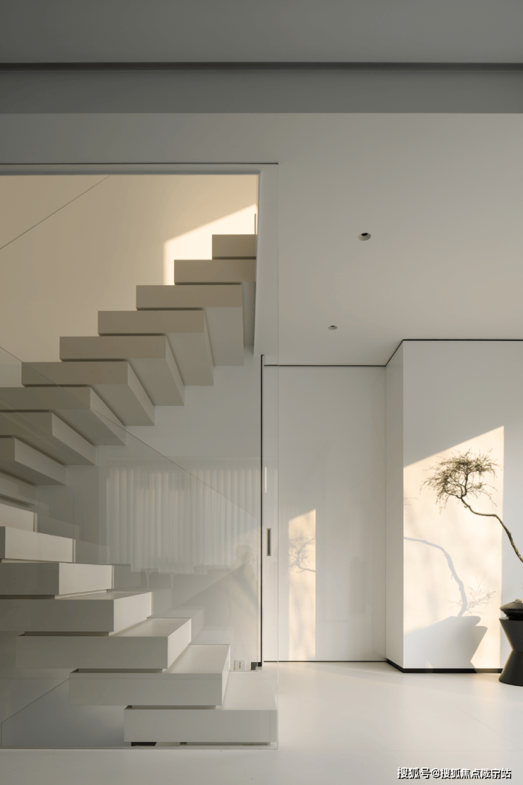楼梯区完全被几何占据,自然光恰到好处的平衡,进一步呼应着空间的心境,衔接了生活和居所。