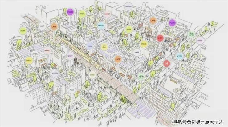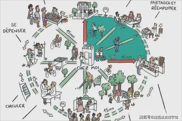 注解:“15分钟城市圈”早在上世纪Carlos Moreno他提出来了这个概念,指的是在15分钟步行范围能满足至少90%的生活需要,解决吃饭、购物、娱乐、学习、医疗、工作。这些由15分钟区域圈出来的圆圈就像一个个细胞,在城市中有机地连接起来,形成一个网状网络,不仅可以更好地满足人的需求,减少了不必要的交通旅行,也可以大大提高人口密度,为圈内居民带来了极大的便利的同时,也能更好地支持地方经济。