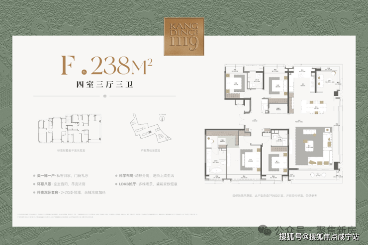约17.2米环绕观景台:约238㎡户型的客餐厅,位于户型的顶端。自东向南环绕270度的观景台长达约17.2米,在这样的客厅,甚至可以踱步欣赏窗外的满眼梧桐。独立会客厅,可以做小茶室或棋牌,更深一步的隐私感,为专享客群定制。康定壹拾玖售楼处电话📞400-8800-703如有问题欢迎来电咨询,来电即可享受买房优惠!