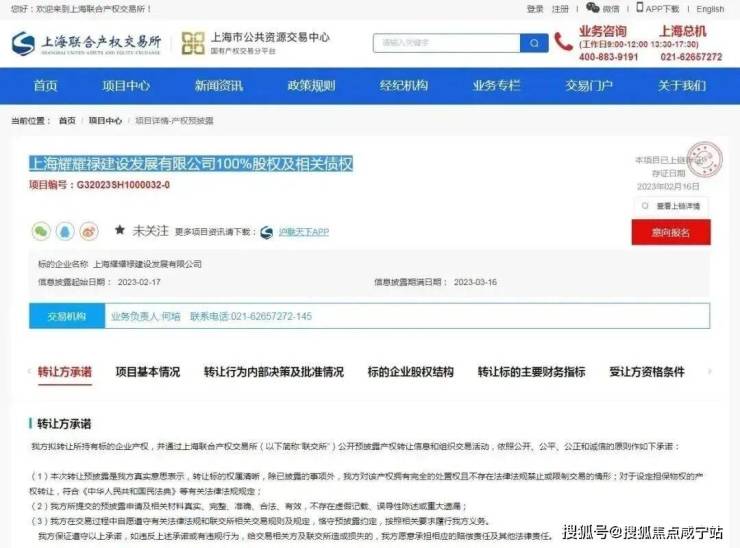 在之后不到两个月的时间内,就在上海联合产权交易所官网上就出现了关于地块项目公司上海耀耀禄建设发展有限公司100%股权及相关债权转让的信息。