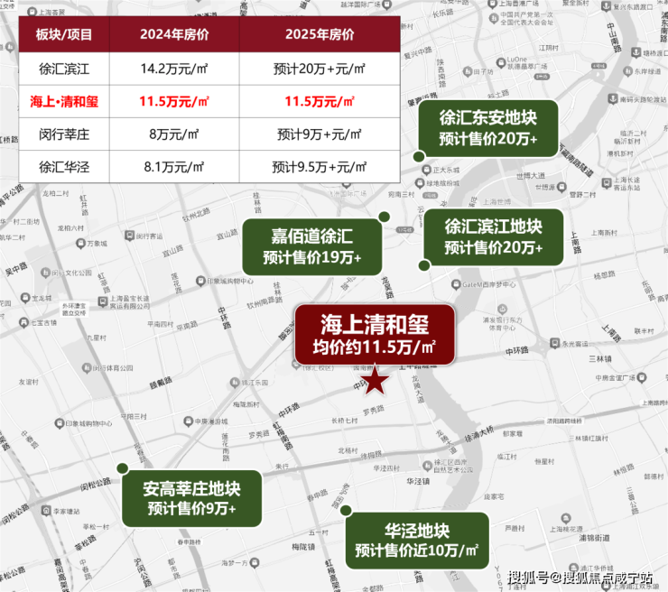 坦白来说,海上·清和玺去年入市的时候,约11.5万/㎡的均价,与徐汇滨江核心区价差不足3万/㎡,与闵行梅陇、徐汇华泾等下游板块价差接近4万/㎡。