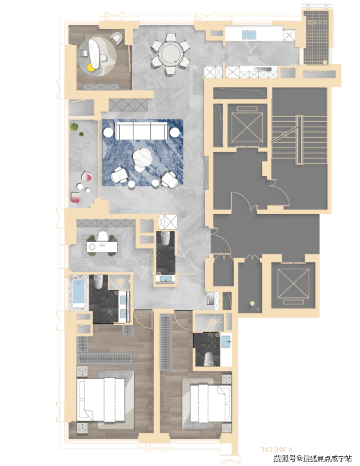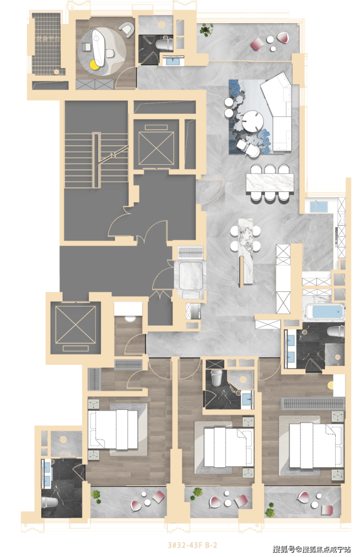 项目中心坐落的中央景观规模约3000㎡,周边环绕着四座建筑,其中三幢为超高层设计,整体布局高低兼顾,启承有序,开阖有度,塑造城市云端生活新方式。