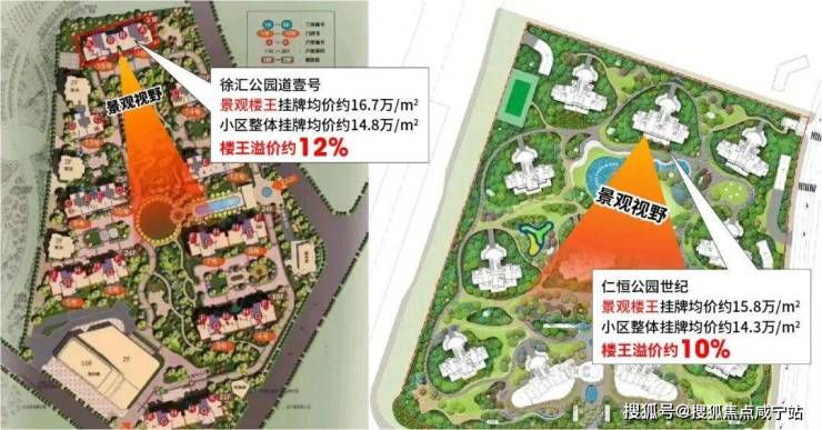 · 徐汇的公园道壹号项目,整盘的挂牌均价大概在14.8万/㎡,景观视野无敌的楼王楼栋挂牌均价要16.7万/㎡,楼王溢价约12%。