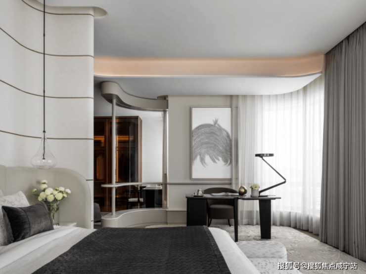 主卧值得点赞,一方面将室内空间与阳台空间巧妙连接起来,实现景观视野更大化,躺在床上也能约270°瞰江。