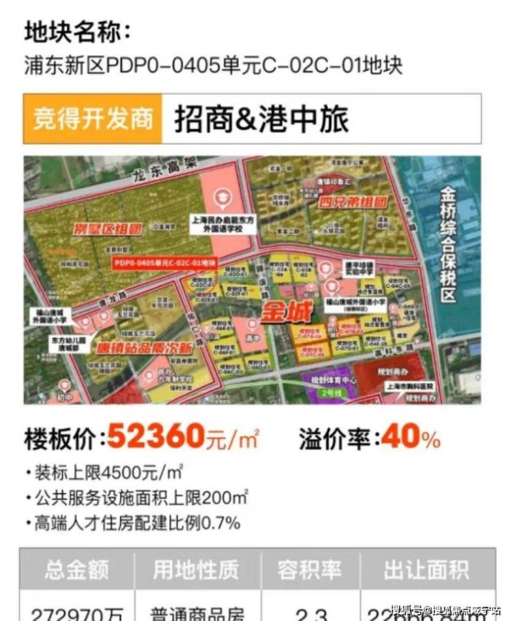 土拍重磅新闻——7月25日上海六批次土拍结束,唐镇地块再次赚足市场眼球!经过62轮鏖战,最终由招商&港中旅以总价27.3亿,楼面价5.24万元/m²夺得!溢价率突破40%!!!未来售价预计将突破9万/m²,已迎来价值爆发窗口期!