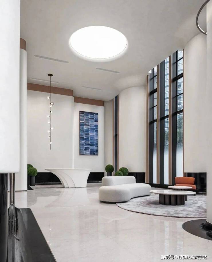 本次开放的6号楼实景大堂,一层单元入户大堂约7米挑高空间,自带归家仪式感。整体风格简约、艺术,圆弧形纹理的吊顶再次呼应整体曲线设计语言,搭配暖色灯光和大面积落地窗,既保证了整个空间的通透敞亮,视野无阻,又巧妙地柔化了氛围,让硬朗的建筑多了份优雅与温馨。