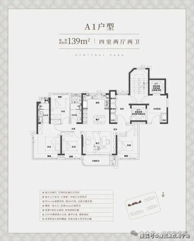 1#为17层,1梯2户设计,12层、15层有连廊,一楼 为配套;2#为14层,1梯2户,没有连廊,首层局部架空;3#17层,1梯2户,12层、15层有连廊,首层架空;4#17层,1梯2户没有连廊,首层局部架空,该楼栋全部为大户型。