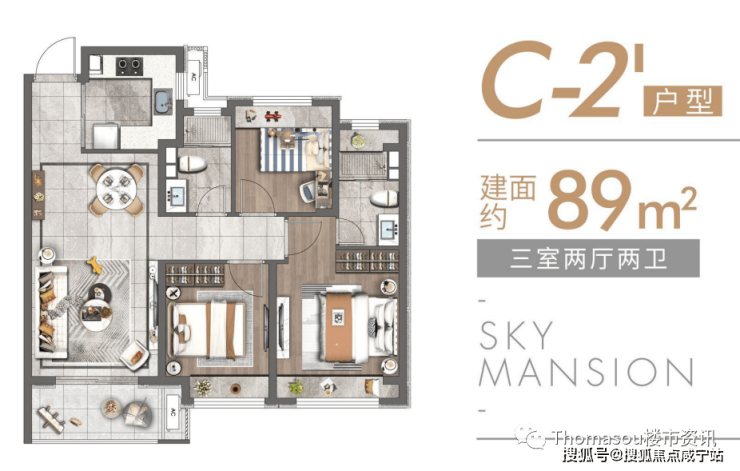 9-10层洋房:建面约89㎡(三房两厅两卫)