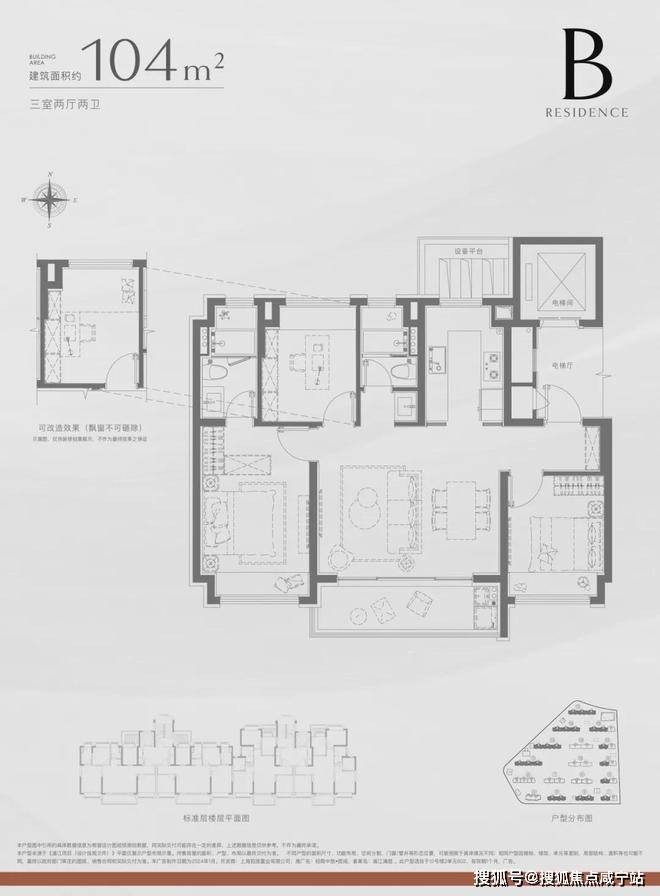 104㎡的户型,采用了大横厅 +270°转角窗设计,南向阔景阳台面宽约5.3米,这样的尺度,在100平出头的面积段极其罕见。另一个南向客卧不管是当成老人房还是客房,都与另外两房做了物理分割,保证了最大程度的舒适度和私密性。
