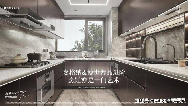 170平户型的装修标准全线升级,材质更显奢华:厨电采用嘉格纳四件套(油烟机、灶具、洗碗机、蒸烤箱)搭配两个博士内嵌式冰箱;