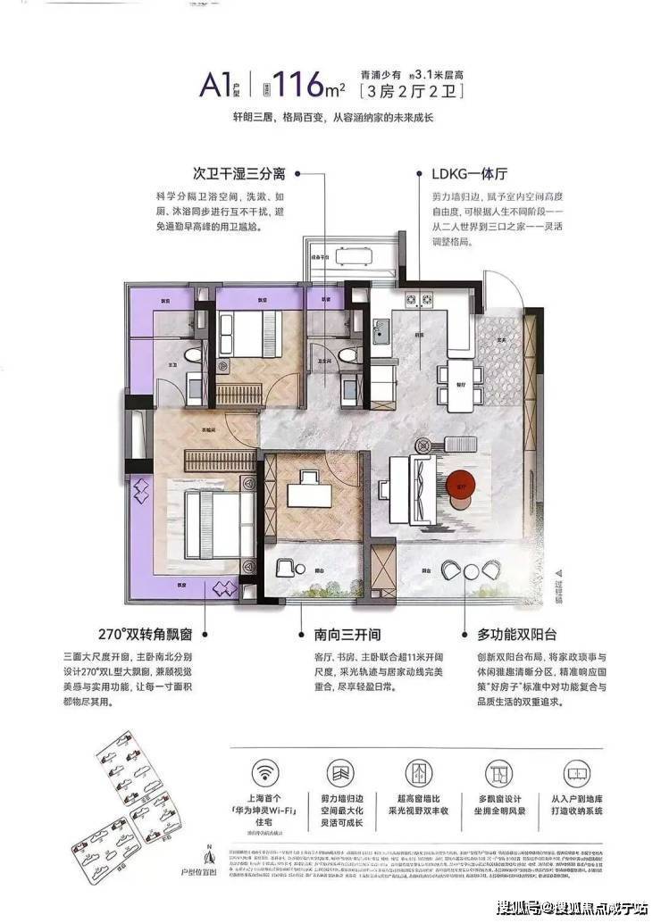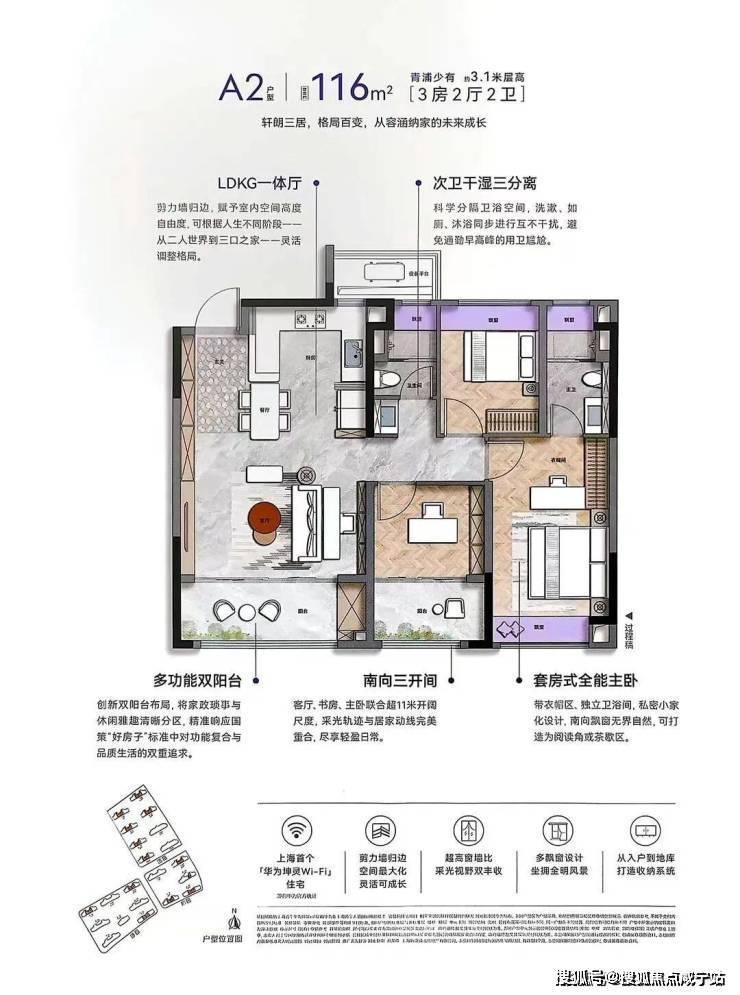 建面约116㎡3房2卫动静分离的户型,几乎是这个市场上最好的户型。