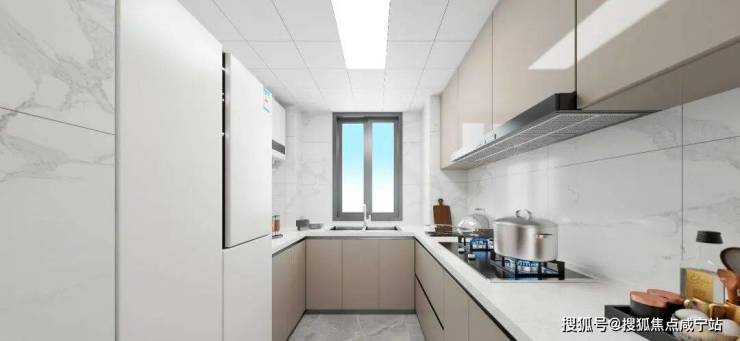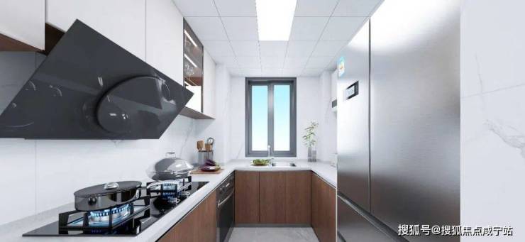 厨房为U型布局,配置定制橱柜、老板烟灶、林内热水器,台面为人造石,水槽为邦克台下盆,细节处体现人性化考量。