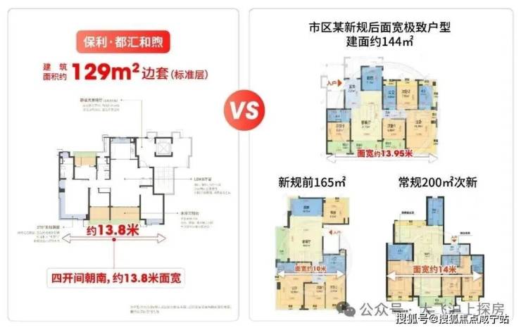 这一尺度不仅远超联排叠墅,在新房市场也处于第一梯队——即便是市中心面宽极致的144㎡户型,面宽也仅约13.95米,而项目以129㎡建面实现相当面宽,甚至超过不少165-200㎡的二手房与新规前产品。