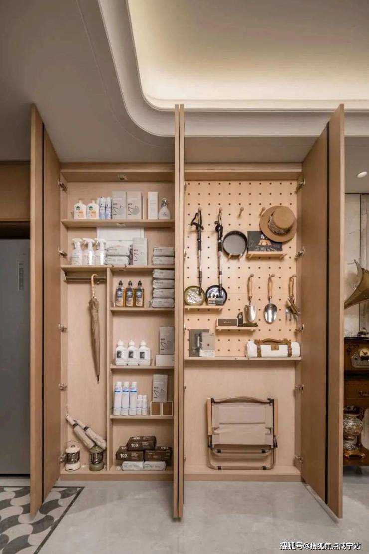 双薄柜设计则大大增加容纳空间,举例来讲,可容纳约200包纸巾,足以满足全家1年使用。而洞洞板设计,则可收纳清洁工具、长柄伞等大件日常用品,如此贴心布局,保证室内物品足够井然有序,也更为利于家庭日常打扫。
