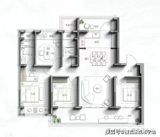如果是高层4房(约128㎡),大概率是四开间朝南的飞机户型,南北通透,主卧套房带衣帽间+独立卫浴+270°转角窗+3阳台设计。