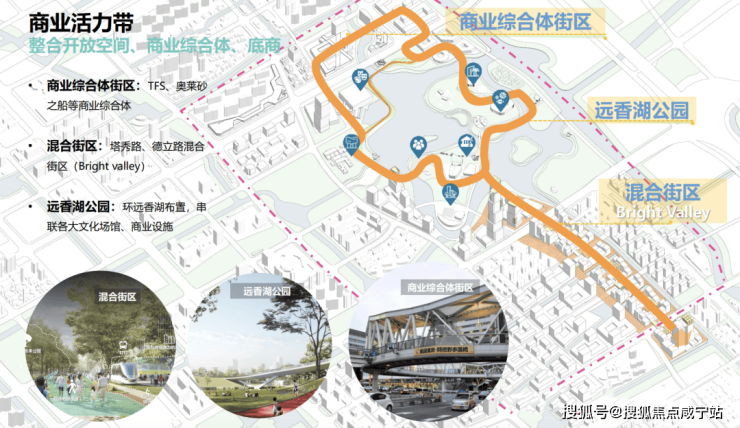 优先发展功能复合度高, 主题特色、体验性强的商业类型,形成辐射长三角的独具文化魅力和时尚活力的区域商业中心:包括北部商业综合体街区、中部远香湖公园商业示范区、Bright Valley区域文化中心,形成区域交通便捷通达,局部商业集聚、功能互补的商业功能区!
