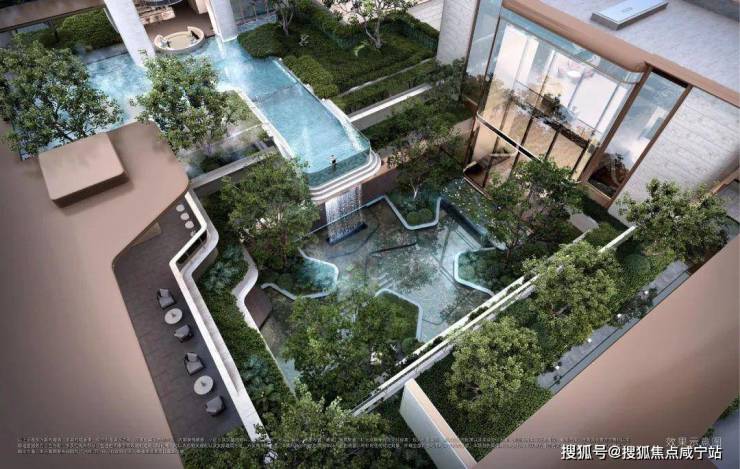 通过多层次、立体化的景观营造,创造一座“漂浮的绿洲”,九重层次下沉庭院,区域悬浮泳池+4.3米飞瀑设计,塑造极致度假感受,丰富的视觉奇观。