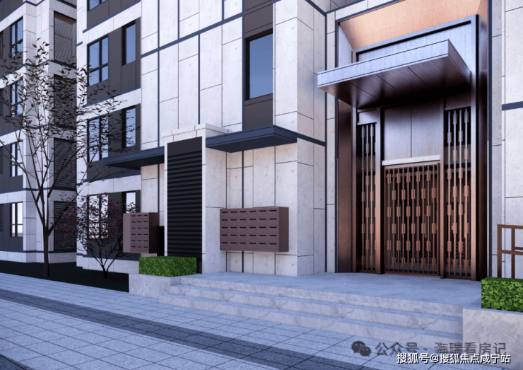 单元门头引入现代审美观念,整体两层通高,以绚丽的金属铝板搭配精致的装饰纹理格栅打造,呈现出高级的品质感,营造出充满仪式感的归家氛围。并且引入业主人脸识别、多种复合刷卡、呼叫方式出入,访客可通过门口机呼叫业主室内机授权入楼,主客进出更方便、更安全。