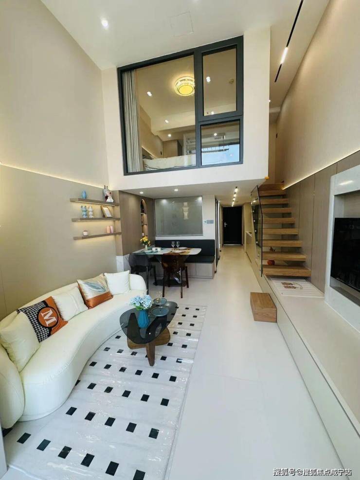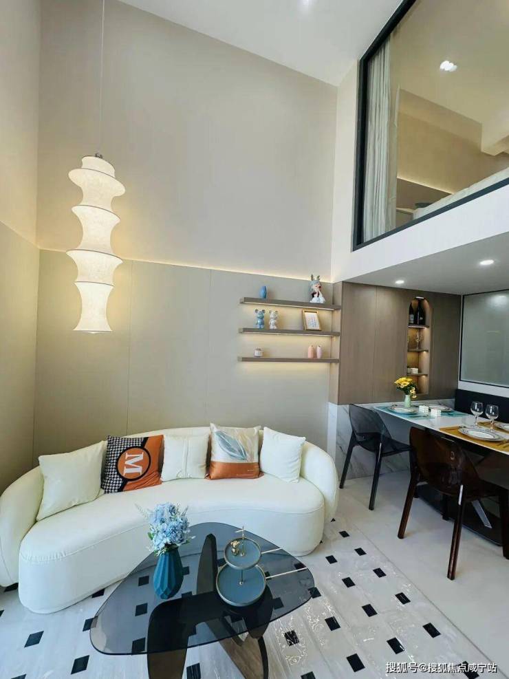 49㎡复式:4.5米挑高设计实现“买一层得两层”,下层为客餐厅与厨房,上层为双卧室布局,得房率达100%。二楼卧室预留储物间位置,业主可根据需求改造成步入式衣帽间。此类户型总价278万起,按实用面积计算单价不足3万/㎡,性价比突出。