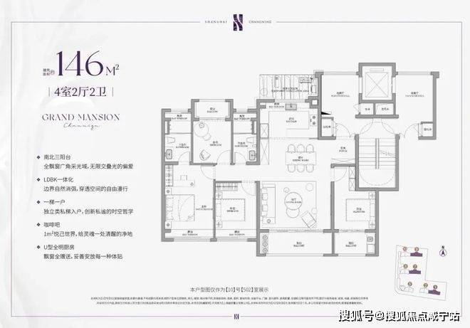 建面约143㎡的4房户型,类一梯一户的设计,每一户都有一个面积约8㎡的独立采光电梯厅空间;四开间朝南+大宽厅,采光效果爆棚;通过LDKB一体化设计,形成一个近50㎡的客餐厅空间,极大提升空间场景的可能性;卧室也采用了酒店化套房设计,主卧贯穿南北套房设计,南北皆有飘窗。