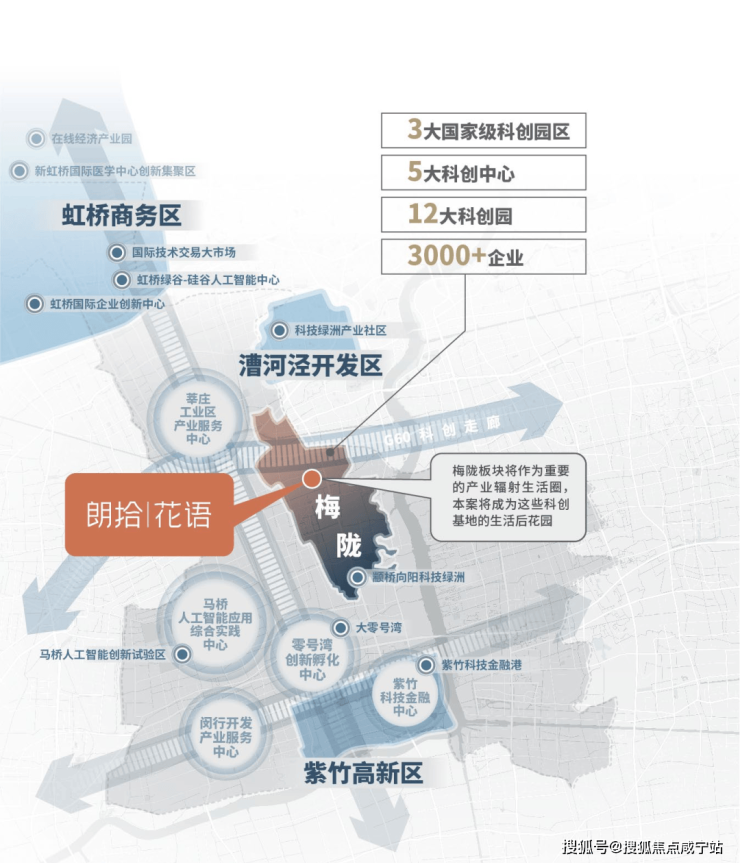 梅陇周边聚焦3大国家级产业区、5大科创中心、12大科创园、3000+企业,与漕河泾开发区、莘庄商务区、紫竹高新技术产业园等科创基地,多元功能区产业联动。沿线产业营收达千亿,入驻企业超1.2万,就业人口超75万!