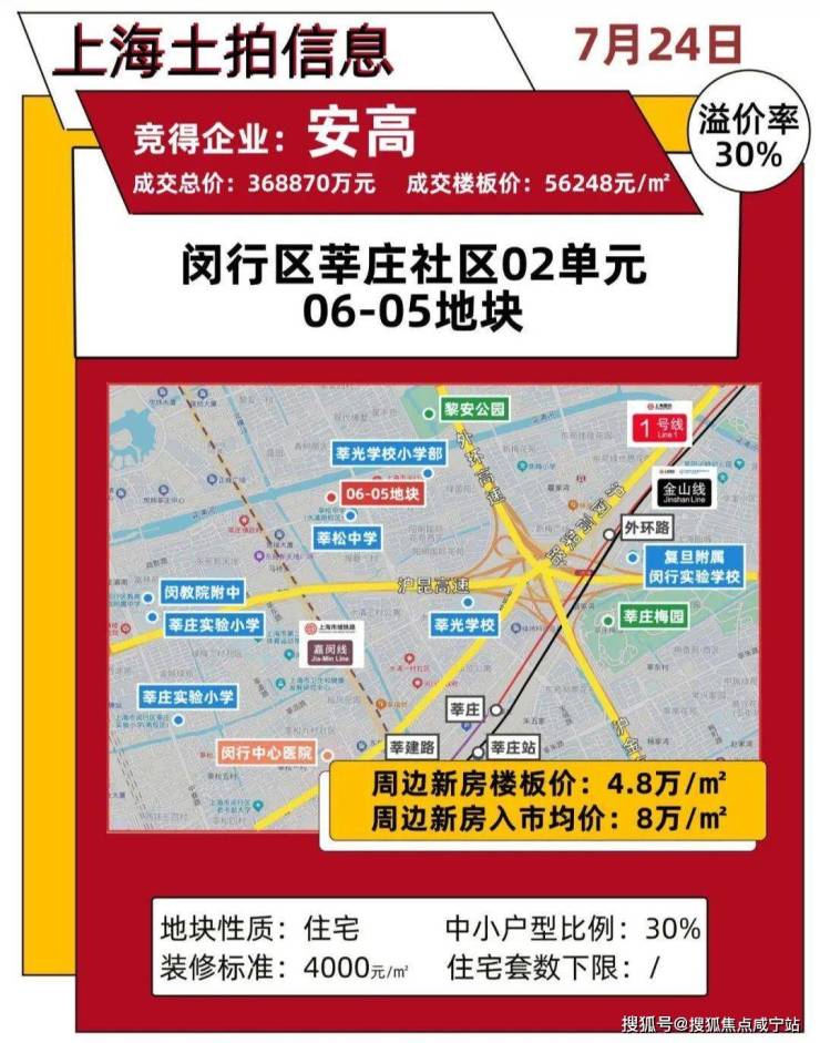 该地块是今年六批次土拍出让,安高当时以368870万元的总价,30%的溢价率拿下了莘庄06-05地块,成交楼板价56247元/平,装标4000元/平。