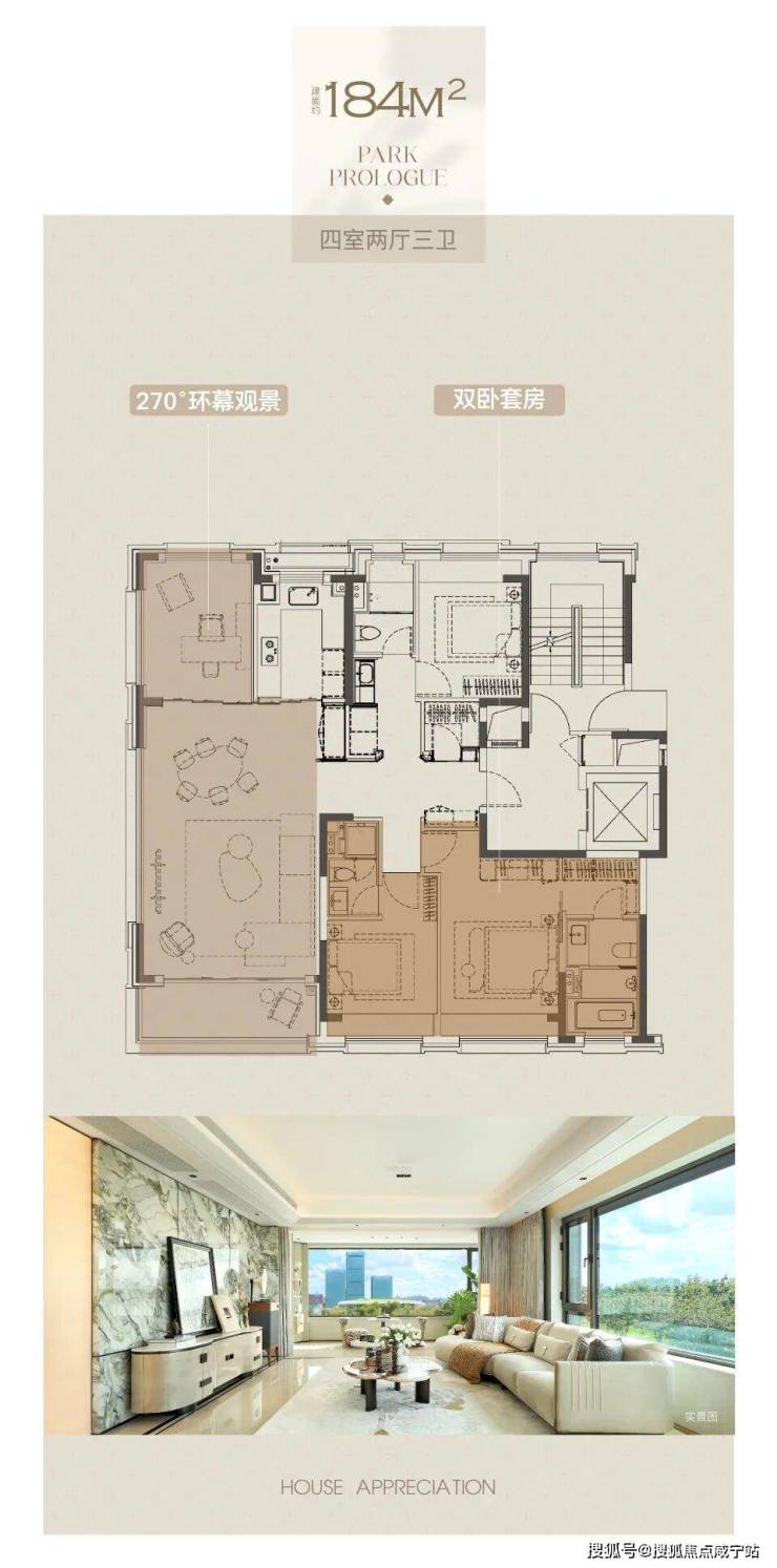 建面约184㎡户型,四房两厅三卫格局,LDKB一体化设计,客餐尺度达7.5米景观面,三面景观环绕的“超级客厅”,最大化引景入室,尽揽中央公园至撼视野,百万方森态谧境成为私享级流动窗景。行政级主卧套房,打造步入式衣帽间、私享卫浴及南向超阔飘窗。在双套房的设计之上,公卫与北向次卧在空间布局上融入巧思,打造出了多一套间的生活体验。
